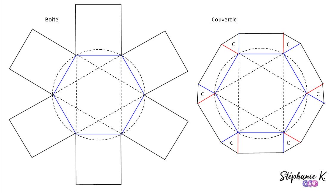 Comme je n’en avais pas d’assez grand pour faire les 3 plus grandes boîtes en une seule fois, j’ai créé plusieurs hexagones de la même taille avec uniquement 1 à 3 côtés que j’ai collés les uns sur les autres pour former l’hexagone complet.